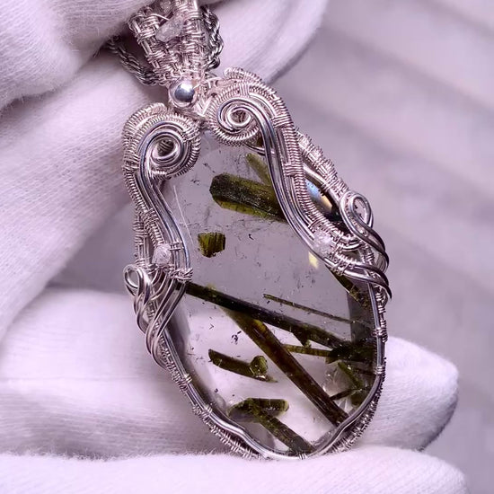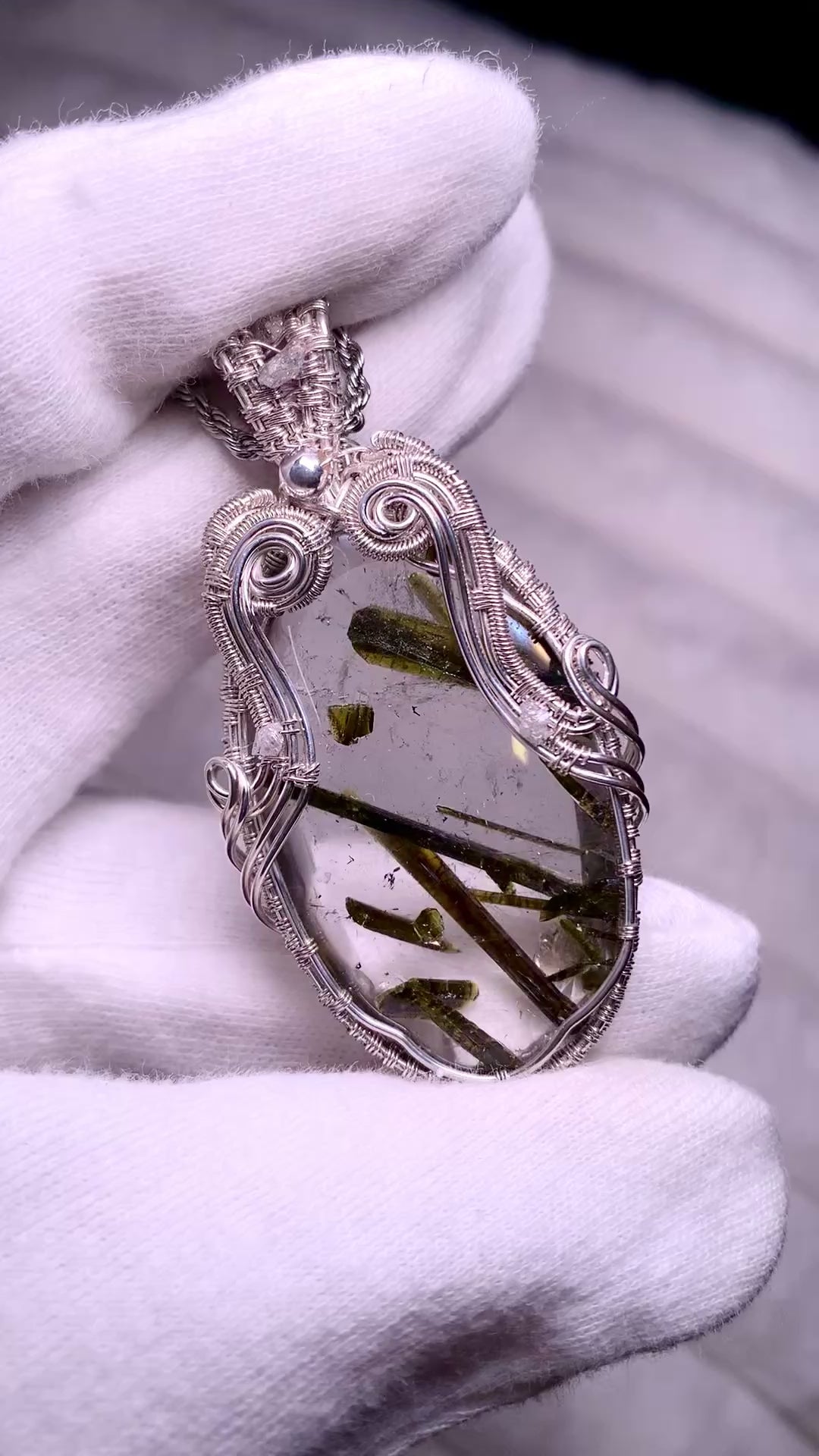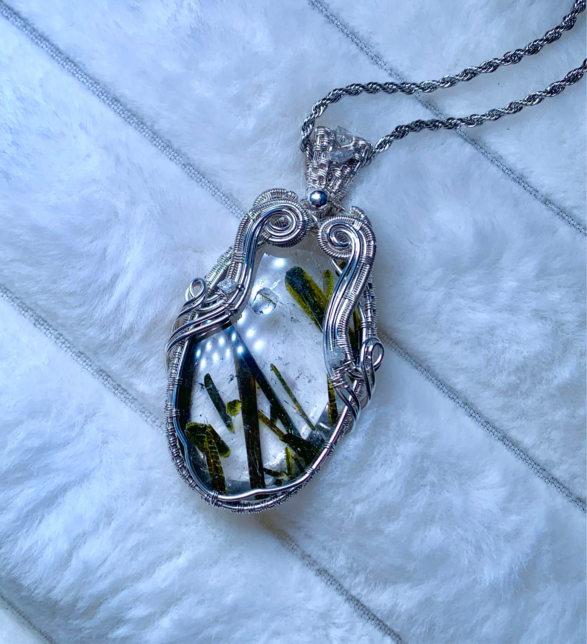 Este dije está elaborado con un cuarzo transparente de alta pureza que contiene inclusiones naturales de turmalina verde, cuidadosamente envuelto a mano en plata de ley 925, lo que potencia sus propiedades energéticas y lo convierte en una joya tanto estética como espiritual.
